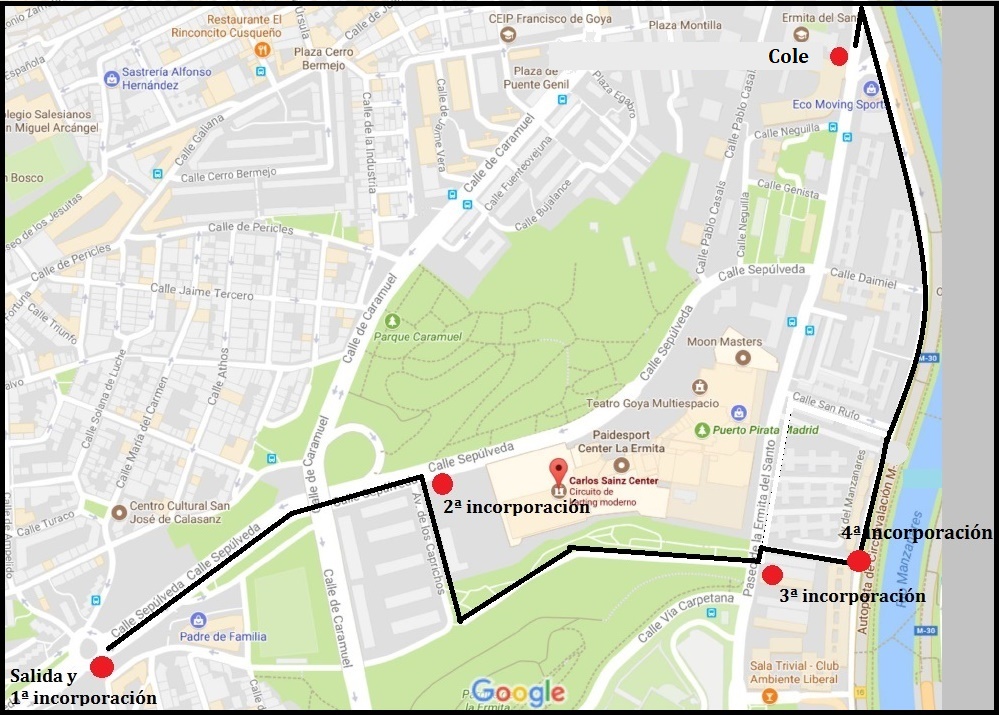 Nos reuniremos a partir de las 08:15 en la última rotonda que hay en la C/ Sepúlveda. Saldremos a las 8:20 e iremos haciendo el recorrido que figura en el plano para recoger a quien se quiera unir: